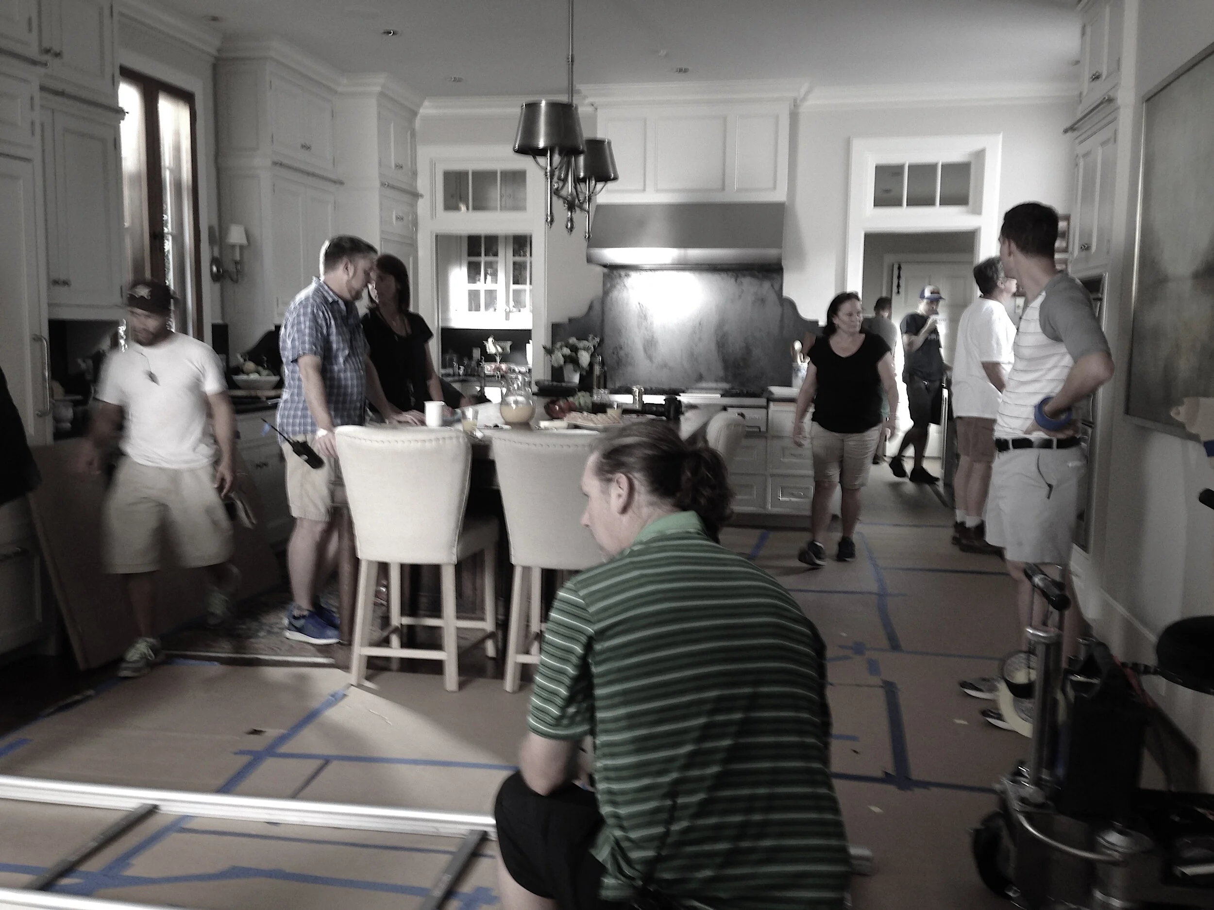 We were standing in a modern kitchen as lights were being set up outside the windows and the art department was hanging blinds and we waited for approval on which plates to set up for the dinner scene. The inexperienced location manager had just argued with Bill, the Director of Photography, that there didn’t need to be additional layout-board on the newly refinished wood floors where we were setting up the shot. Bill knew there would be more lights and flags on metal stands to come; he knew where the dolly tracks would be going down for the camera move.