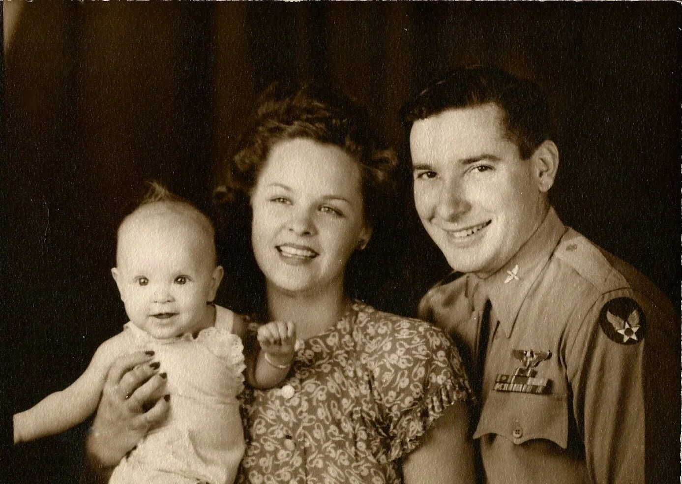 This Joe Farber was dashingly handsome. He came from a different world, with the black hair and olive skin of his Spanish-German heritage. A big smile and a twinkle of joy in his eyes. He adored my mother. And his two girls. And he looked like the stuff of movies in his uniform beside his plane.