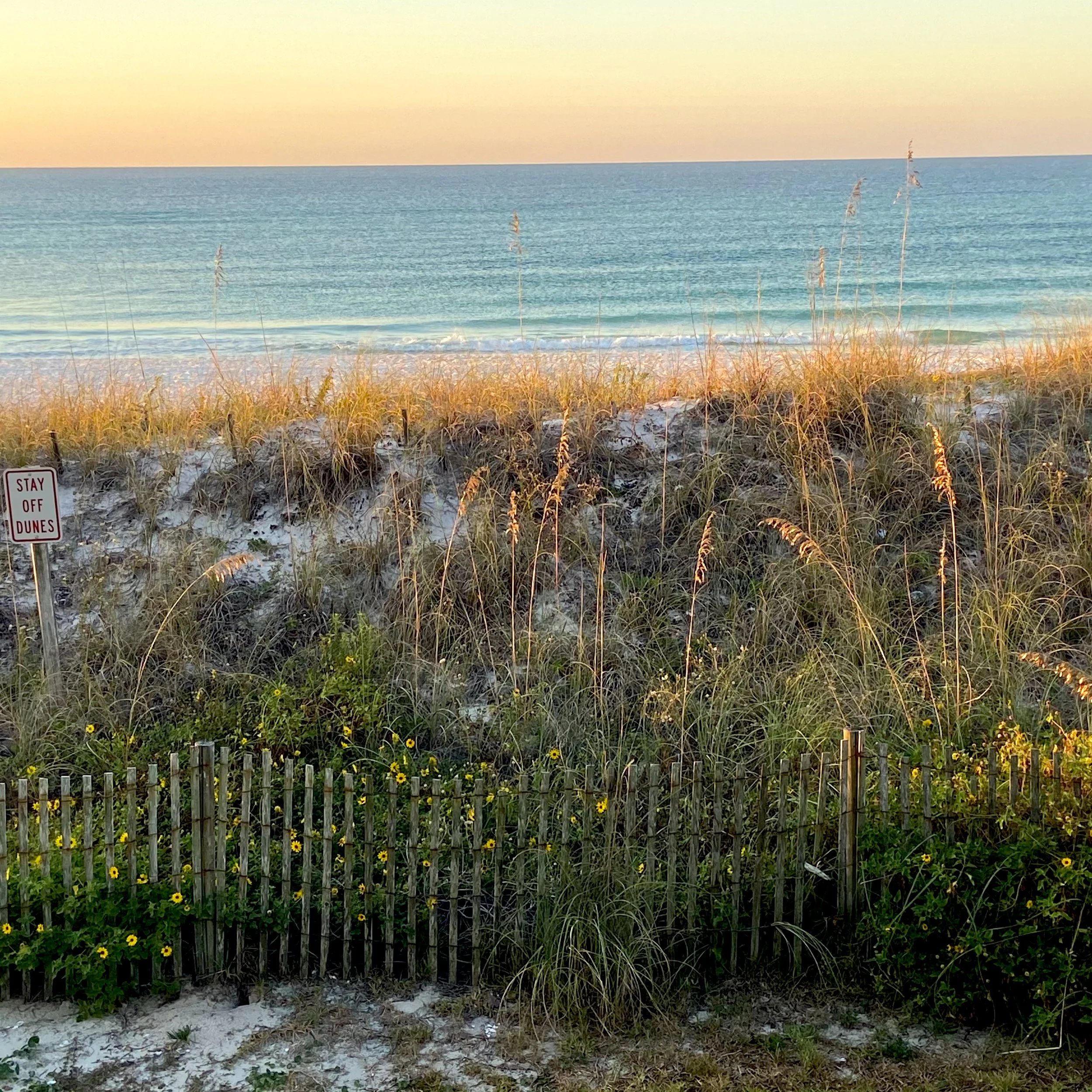 For five wonderful days, I have a room with a view. A white balcony railing separates me from a short lawn of green grass, giving way to sand dunes edged with golden flowers and sea oats bending slightly in the ocean breeze. Beyond that, powder white sand meets white foam waves and beyond that emerald waters roll from the deep marine blue of the gulf until a straight horizon line glows white lifting up to bluer and bluer heavens. This sky changes depending on if it is being lit by the sun we circle or the moon which circles us. Pods of dolphins arc as they travel east to west, butterflies and dragonflies too numerous to count flitter in shadow and light.