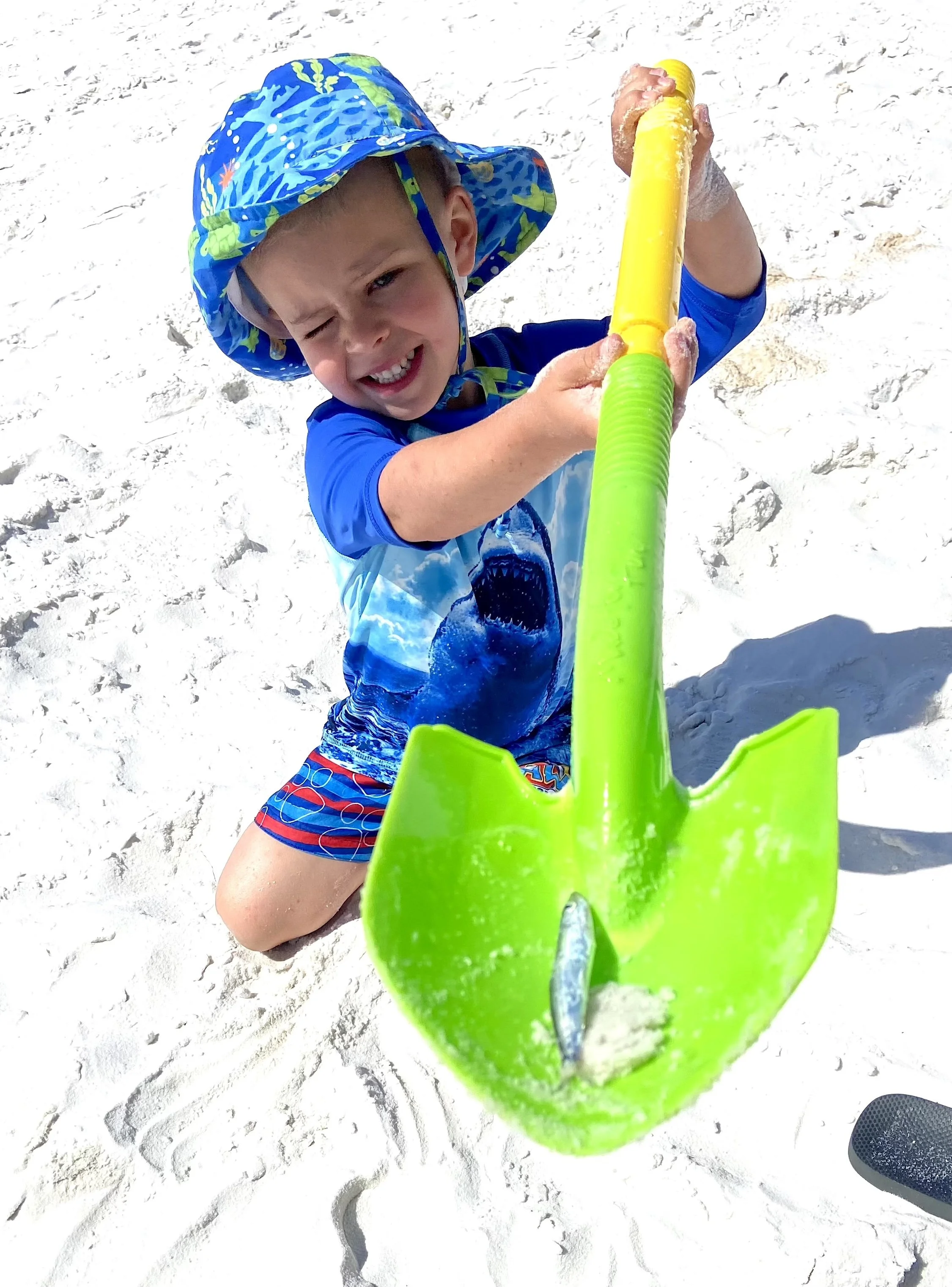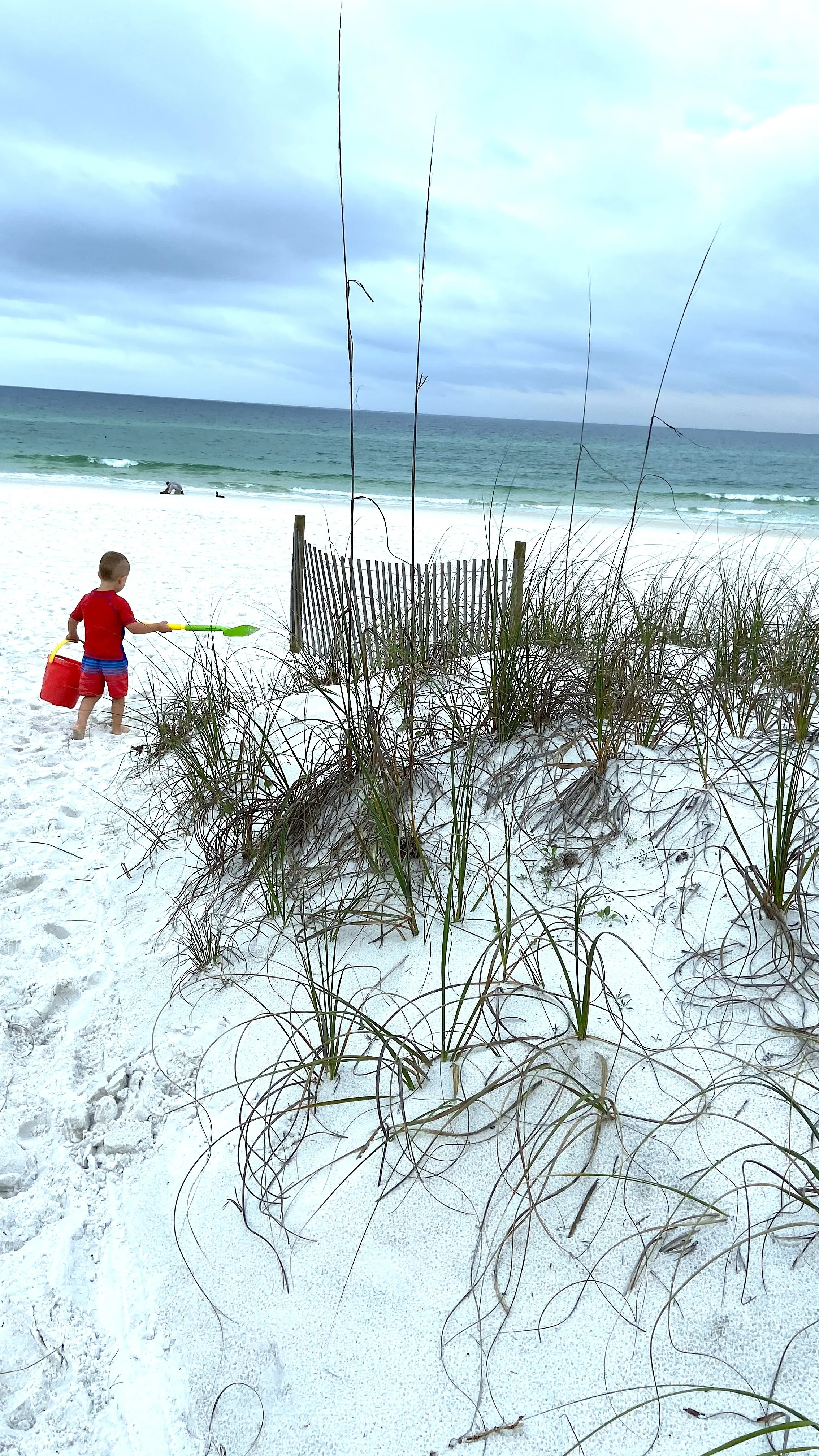 He is four years old, and his joy is full and complete. He stands ankle-deep in the water and screams a primal scream out to the sea. Here, the pelicans fly in formation, the sandpipers run leaving staccato tracks while C-130s fly overhead from Eglin. Ours is a short walk through sand dunes over soft powder sand from the smallest condo we could find where we can still hear the low rumble of waves as they fall against the shore.